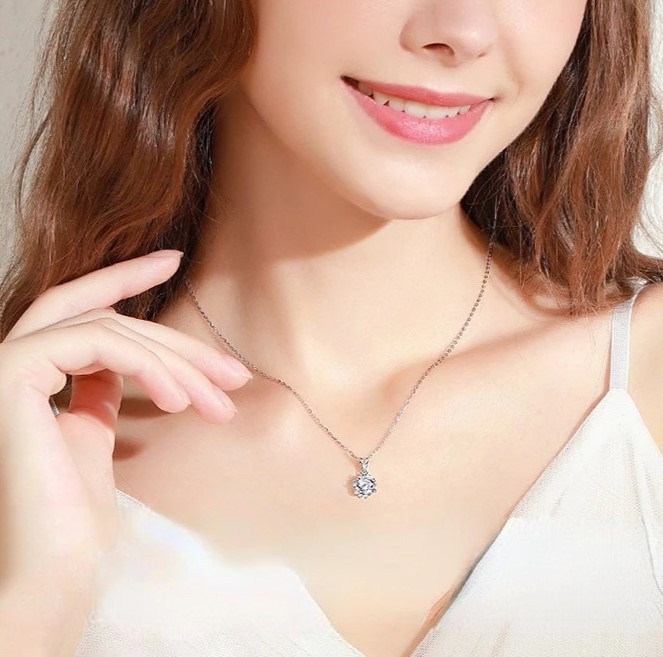 רשרת קלאסית ועדינה עם תליון מואסונייט זוהר בחיתוך עגול, משובץ במסגרת כסף סטרלינג 925. עיצוב נקי ועל־זמני שמעניק מראה יוקרתי לכל הופעה.
